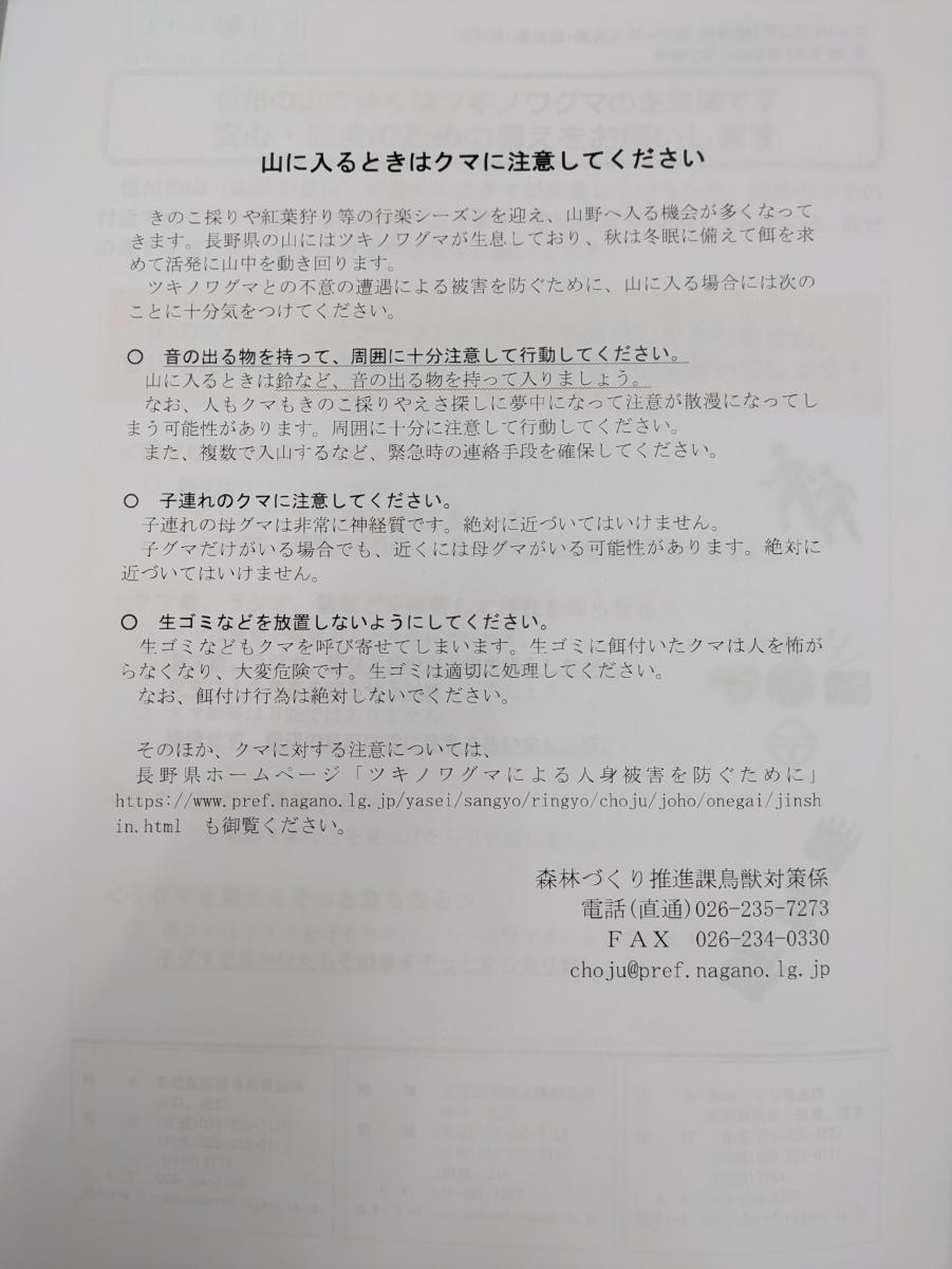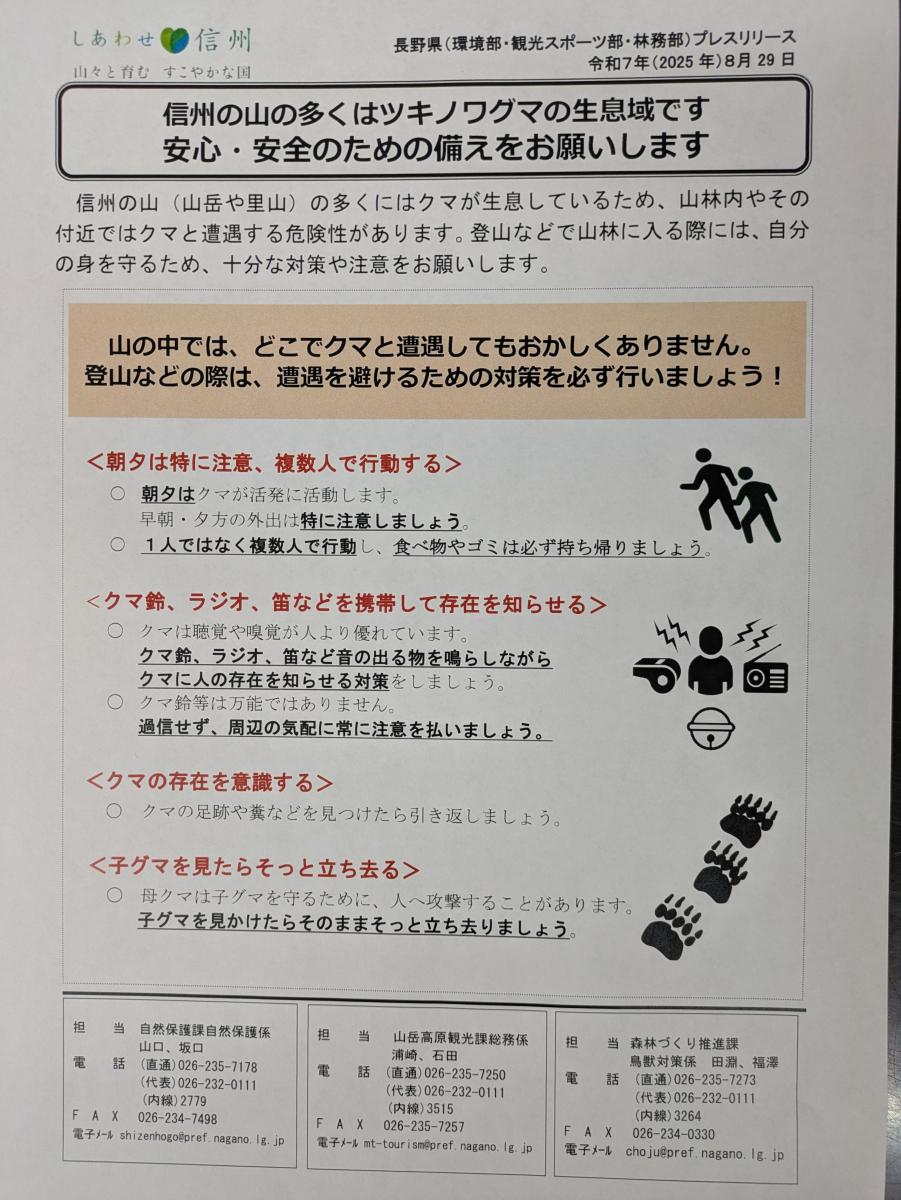 2025.12.14 熊の注意情報 信州の山 の多くは ツキノワグマの 生息 域 です 安心・安全のための備えをお願いします 山の中では、クマと遭遇してもおかしくありません。 出かける際は複数人で行動する、クマ鈴、スマホ等音の出るものを鳴らしながら行動するなど対策を必ず行ってください 当館でもクマ鈴や撃退スプレーを用意しております。 散策にお出かけの際はフロントにお声がけください 一覧へ戻る ホームへ戻る